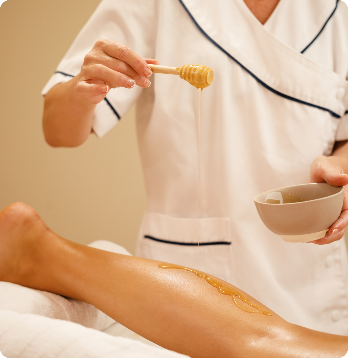 Sugaring: Natürliche Haarentfernung mit Zuckerpaste, die besonders gut für empfindliche Haut geeignet ist und das Risiko von Reizungen minimiert.